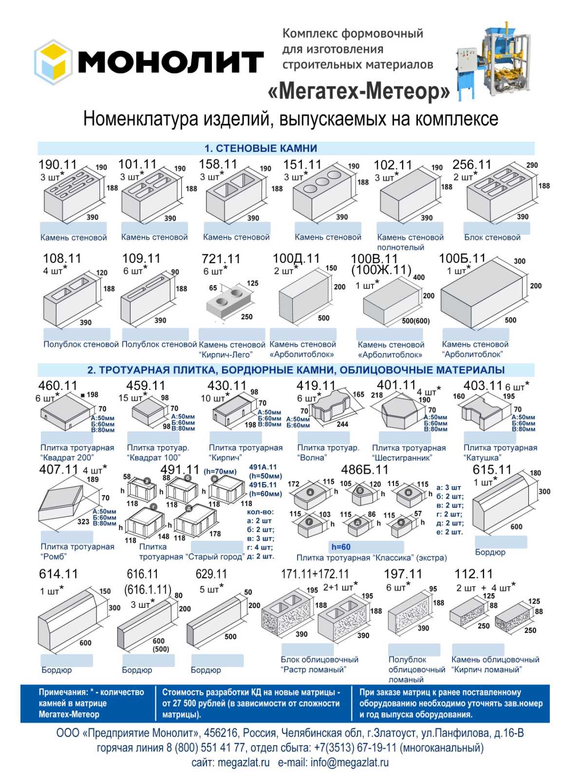 Размер камня: 198*98*70(80,60,50) мм Количество в матрице: 9 шт Для вибропресса: Мегатех-Метеор