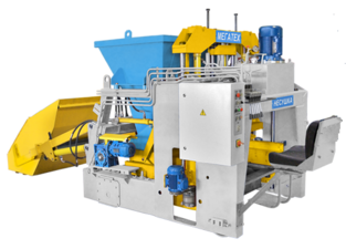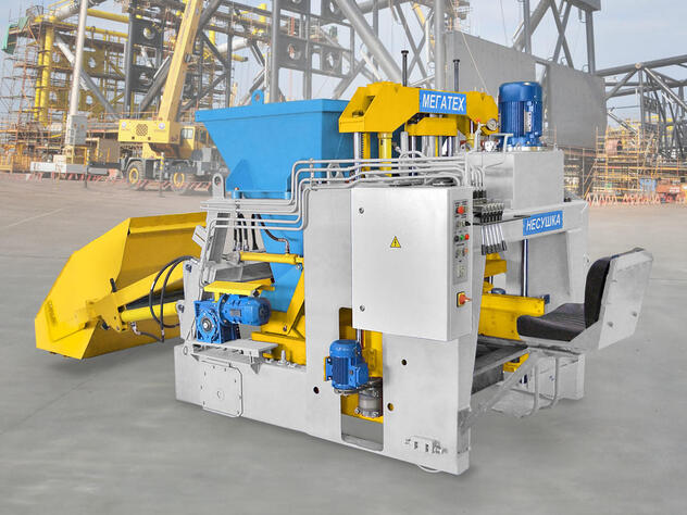Самоходная вибропрессующая установка для производства стеновых камней. Оснащена устройством для самозагрузки