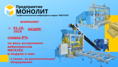Предприятие Монолит является заводом-изготовителем стационарных и передвижных вибропрессов Мегатех для производства строительных материалов: бордюров, тротуарной плитки, стеновых и декоративных материалов, арболитовых блоков, фундаментных блоков ФБС всех типоразмеров. Преимущества работы с Заводом: Качественное оборудование, работающее долгие годы и позволяющее выпускать продукцию по ГОСТ. Наличие оборудования на складе. Цены без дилерских наценок. Гарантия на продукцию 14 месяцев. Постгарантийное обслуживание (наличие зап.частей и комплектующих). Грамотная консультационная поддержка при организации производственного процесса. Онлайн консультации в период эксплуатации оборудования. Звоните 8 800 551 41 77!